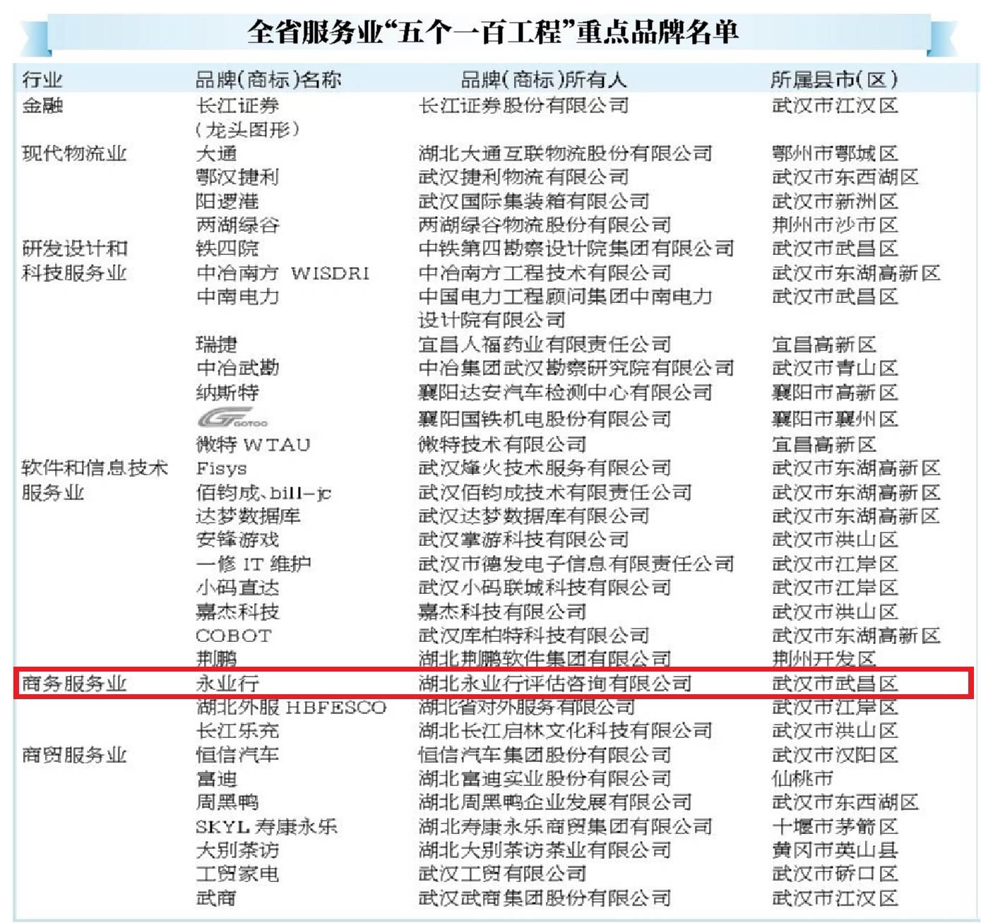 近日,湖北省服务业工作领导小组公布了全省服务业“五个一百工程”重点企业、重点品牌、示范园区名单,永业行获认定为湖北省服务业重点企业、重点品牌。这是继2014年以来,永业行再度获此两项殊荣。