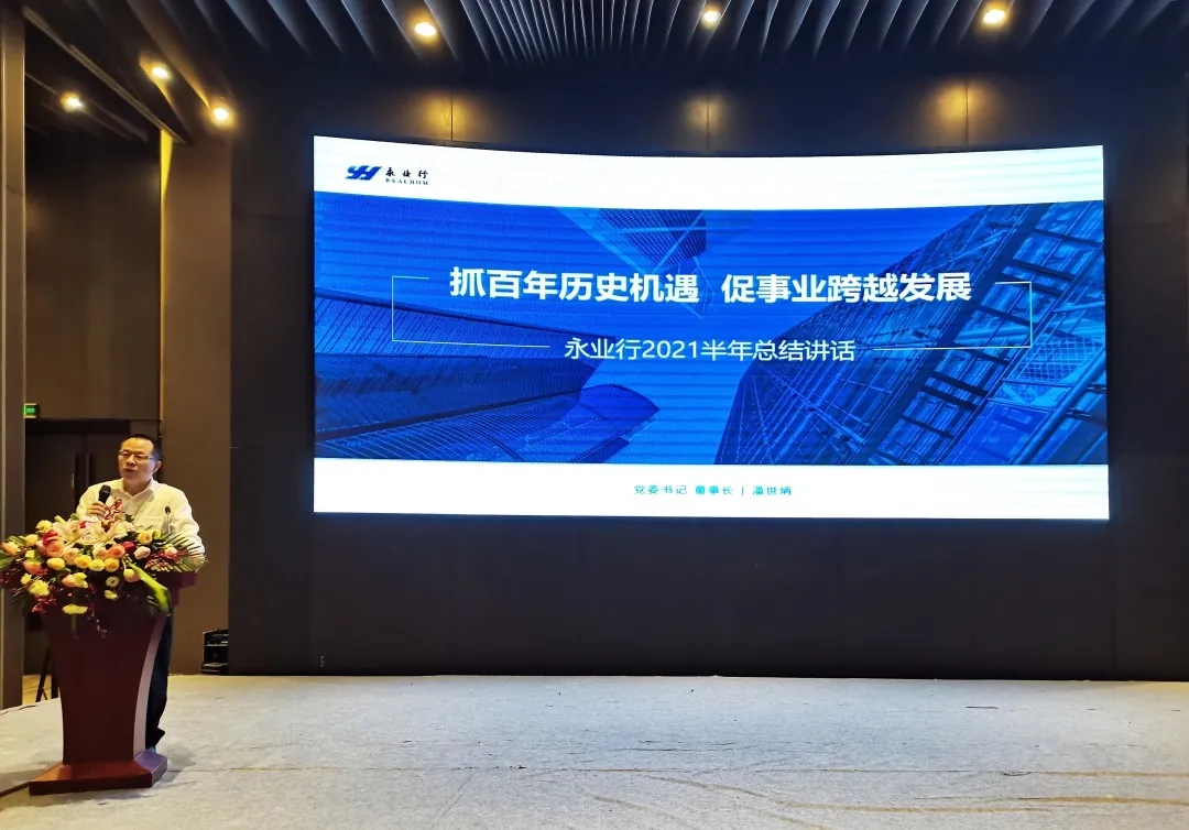 党委书记、董事长潘世炳在会上作主题为《抓百年历史机遇 促事业跨越发展》的讲话。他结合国内外宏观经济形势带来的重大机遇,深刻分析了永业行面临的发展机遇和挑战,从“形势带来的重大机遇、升级经营管理体系、补齐短板突破瓶颈、提高认识切实行动”等方面对下半年工作开展做了明确规划部署。他强调,中高层管理人员要秉承“五位一体”管理理念,不断提升眼界高度和“三个引领”能力,加强对公司战略和制度的理解、传递与执行,围绕“业务创新、管理创新、结构创新”主线,夯实管理基础、整合技术优势、深挖市场潜力、强化团队建设、筑牢风控防线,切实有效的提升公司核心竞争力,持续扩大永业行品牌影响力,全力助推永业行实现高质量跨越式发展。