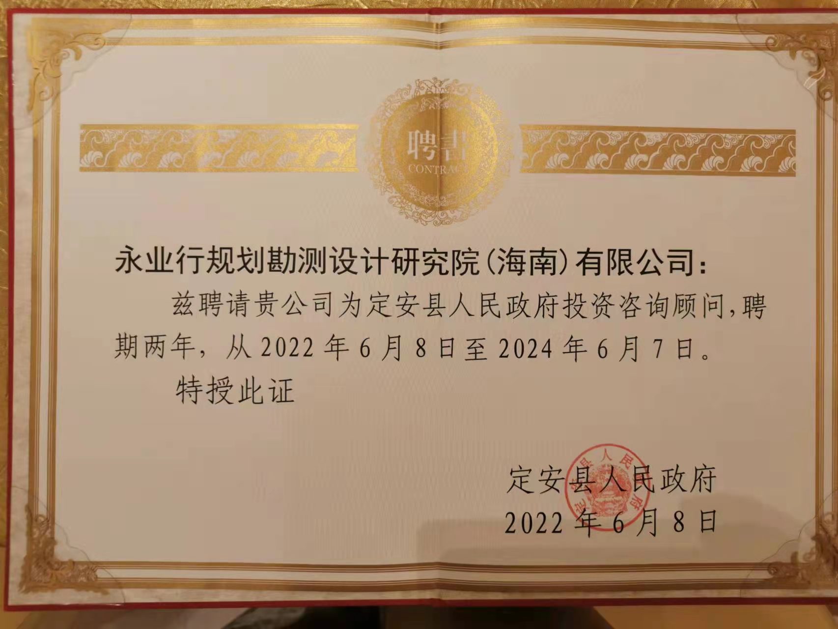 本次会议向永业行等4家企业、个人颁发政府顾问聘任证书。自服务定安县政府以来,永业行始终紧跟国家政策导向,依托传统优势资源,整合投资咨询、自然资源、价值咨询、生态环境的专业资源,以“策、规、投、融、建、管、运、信”八字方针为指导,不断为定安经济发展贡献提供咨询服务。本次受聘为政府投资咨询顾问,是定安县政府对永业行技术实力的充分肯定,我们将持续在城镇化建设、六水共治等领域做好项目谋划、专项债项目包装、投融资模式创新、资金争取等工作,为定安县资源环境开发利用和经济社会高质量发展贡献专业力量,加快定安县融入海口经济圈速度。