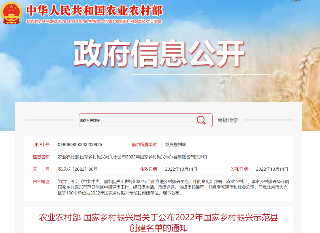 10月14日,《农业农村部、国家乡村振兴局关于公布2022年国家乡村振兴示范县创建名单的通知》发布,丹江口市以综合评分居湖北省4个上榜县(市)第一的成绩入选《2022年国家100个乡村振兴示范县创建名单》。