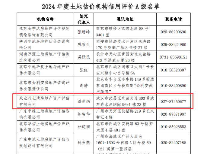 全国第六,湖北第一!永业行连续十六年获评“土地估价机构信用评价A级资信”