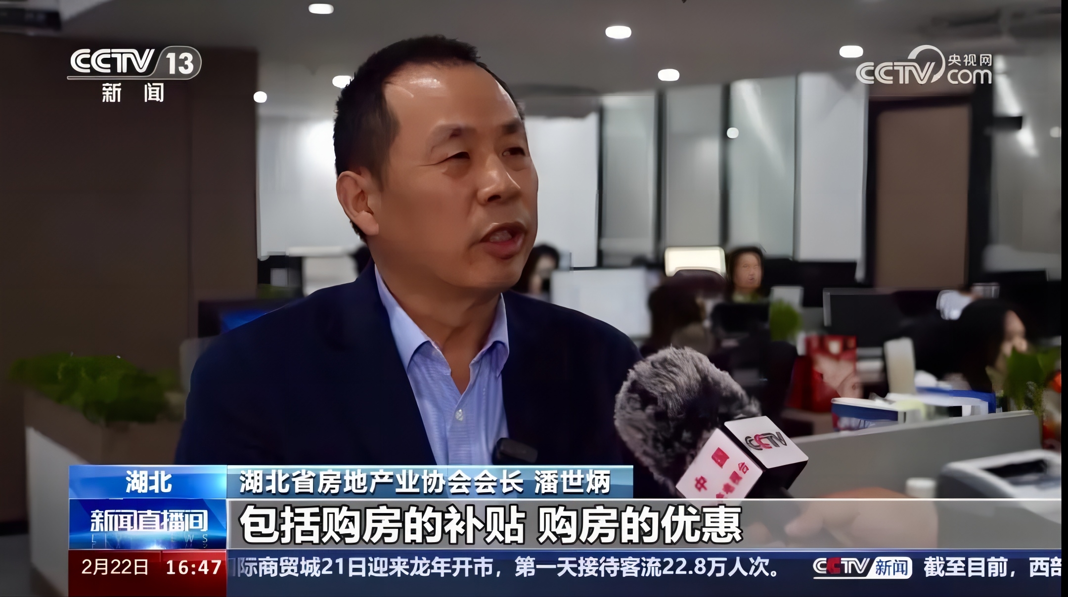 2024年2月22日,中央电视台《新闻直播间》、《中文国际频道》节目播出“房地产市场观察,多地购房优惠政策吸引返乡置业客群增多”报道,省房地产业协会会长、永业行董事长潘世炳接受央视记者采访。