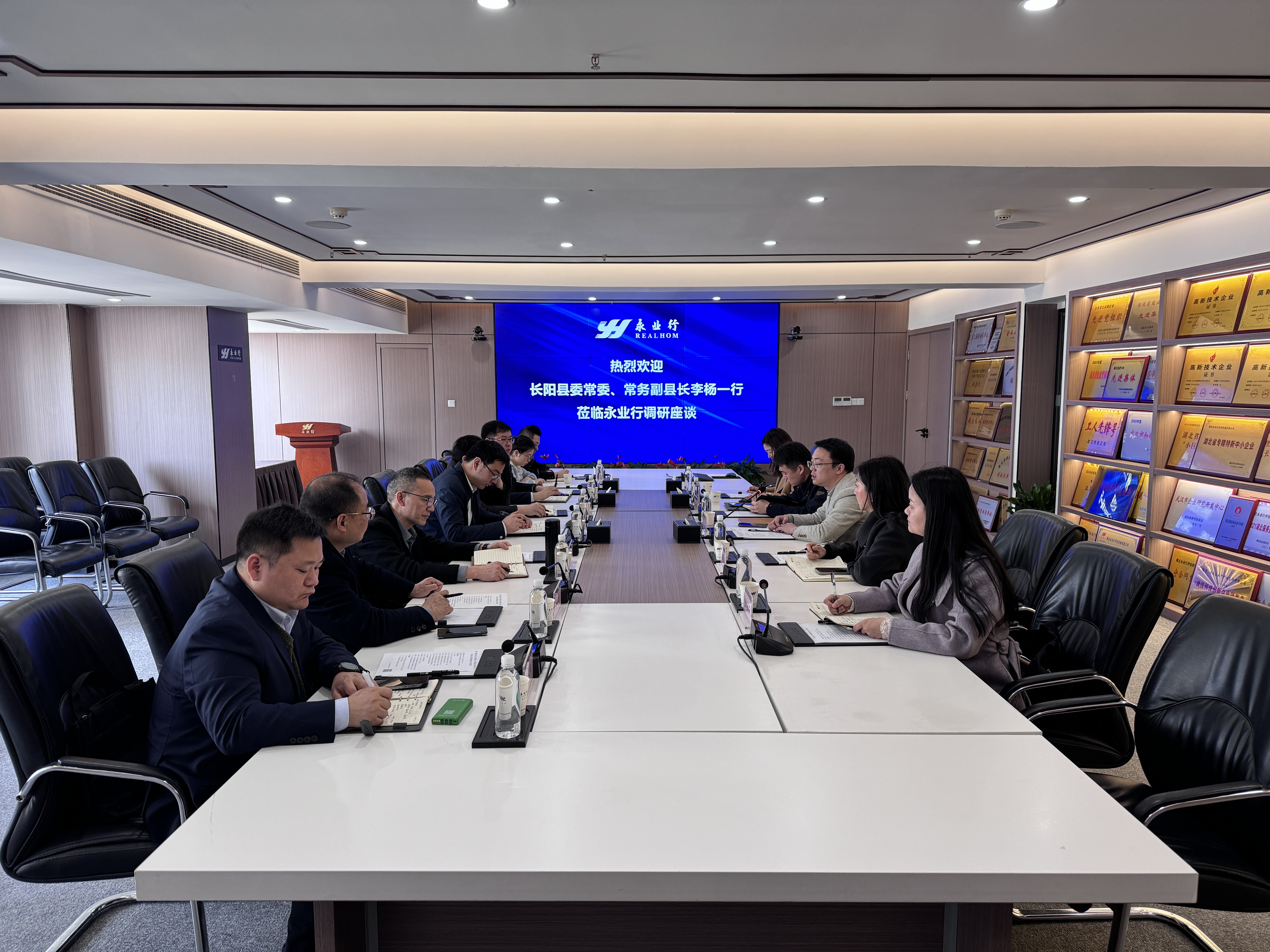 文云波对李杨一行表示热烈欢迎,感谢长阳县各级领导长期以来对永业行的信任与支持。并从公司发展历程、创新研发、产业链规划、投融资领域智库服务、政策试点示范工作等方面介绍了永业行相关情况。他表示,永业行将充分发挥专业优势,加强与长阳县的沟通交流,全力以赴助力长阳县经济社会高质量发展。