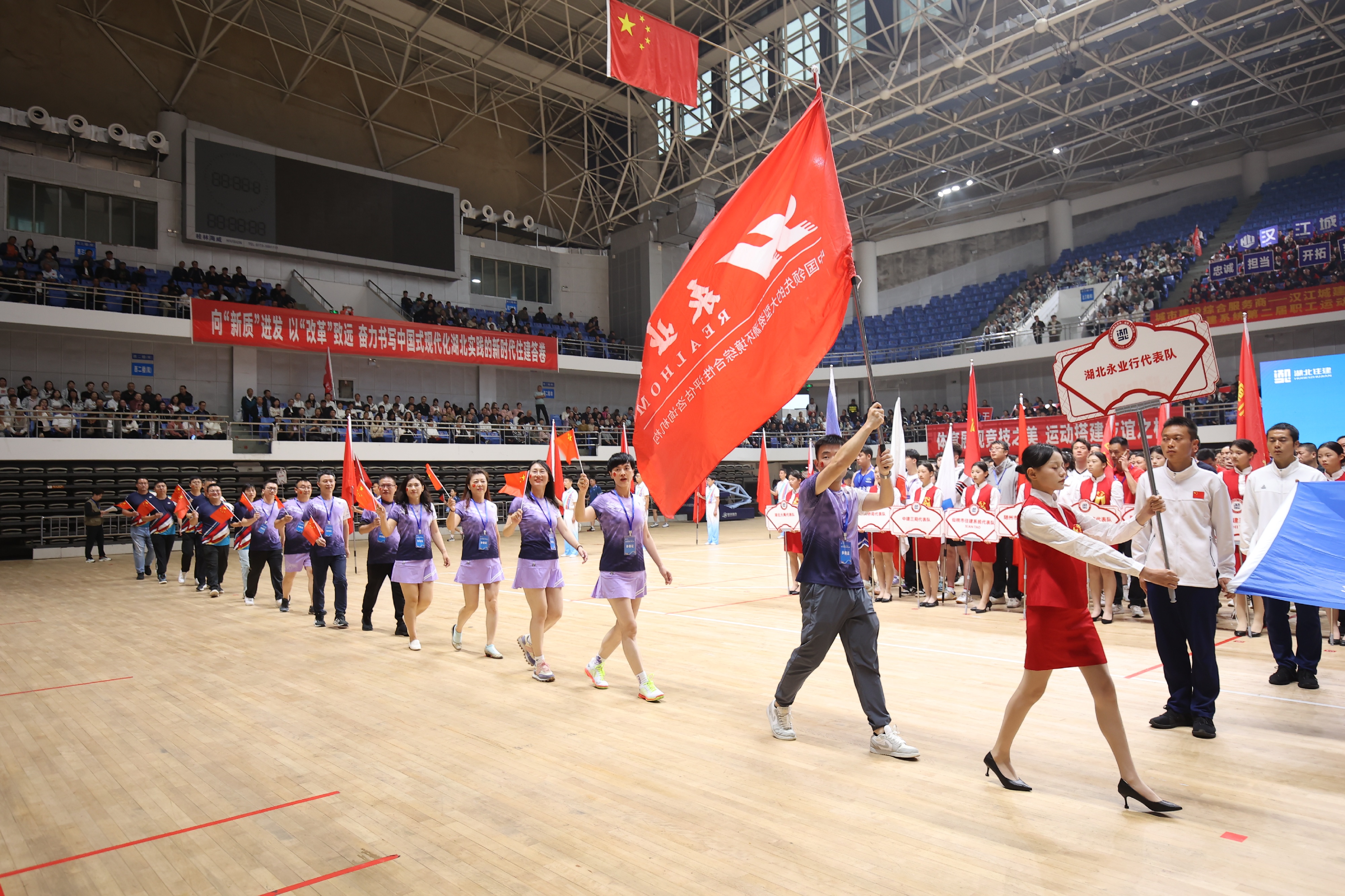 2024年10月17日,全省住建系统“奋进新征程·同心向未来”第二届职工运动会在襄阳市体育馆精彩开赛。来自省住建厅以及全省17个市州住建系统的干部职工和26家住建行业企业代表队的共计千余名选手欢聚一堂,同场竞技。永业行选派10名羽毛球选手组建“羽之队”参加比赛,共享运动盛宴。