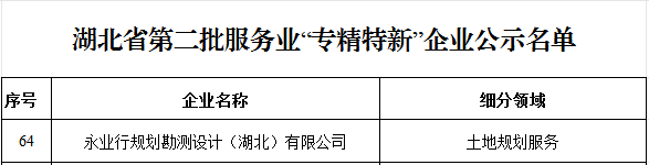 近日,湖北省发改委公示湖北省第二批服务业“专精特新”企业认定名单,永业行旗下“永业行规划勘测设计(湖北)有限公司”成功获评。