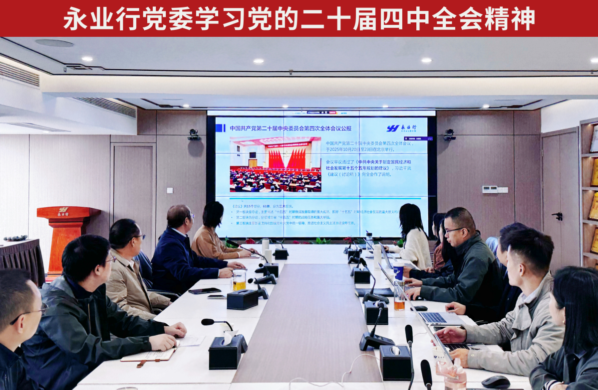 永业行组织召开党委(扩大)会议学习党的二十届四中全会精神 2025-10-27 2025年10月26日,永业行召开党委(扩大)会议,组织专题学习党的二十届四中全会精神,强化党建引领,推动企业高质量发展。永业行党委书记、董事长潘世炳及全体高管、各民主党派永业行支部委员、各部门负责人、业务骨干参加学习会议。 会上,研究院(碳中和研究中心)系统介绍了《中国共产党第二十届中央委员会第四次全体会议公报》,重点阐述了“十五五”时期经济社会发展的主要目标,深入剖析“六个坚持”重要原则,并立足永业行发展实际,结合全会提出的12项战略任务,围绕构建现代化产业体系、深化市场经济改革、推进绿色低碳发展等方面,进行具体解析并提出将 MORE