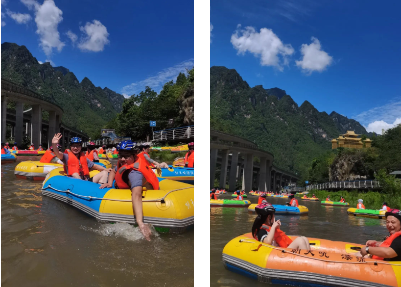 河流时而湍急时而平缓,漂流似乎唤起了大家的童心,河道中顺着水流你追我赶,一旦在平坦处“相撞”少不了要一场戏水激战,船上伙伴两两合力,控制着船只疯狂反击,激流的呼喊声与相撞的“战斗声”响彻山谷,飞溅的流水浸透了衣服,大家却感到更加快乐。此刻,是同事,更像朋友兄弟,所有伙伴都深刻体会到了独木不成林,团结才是力量的道理。