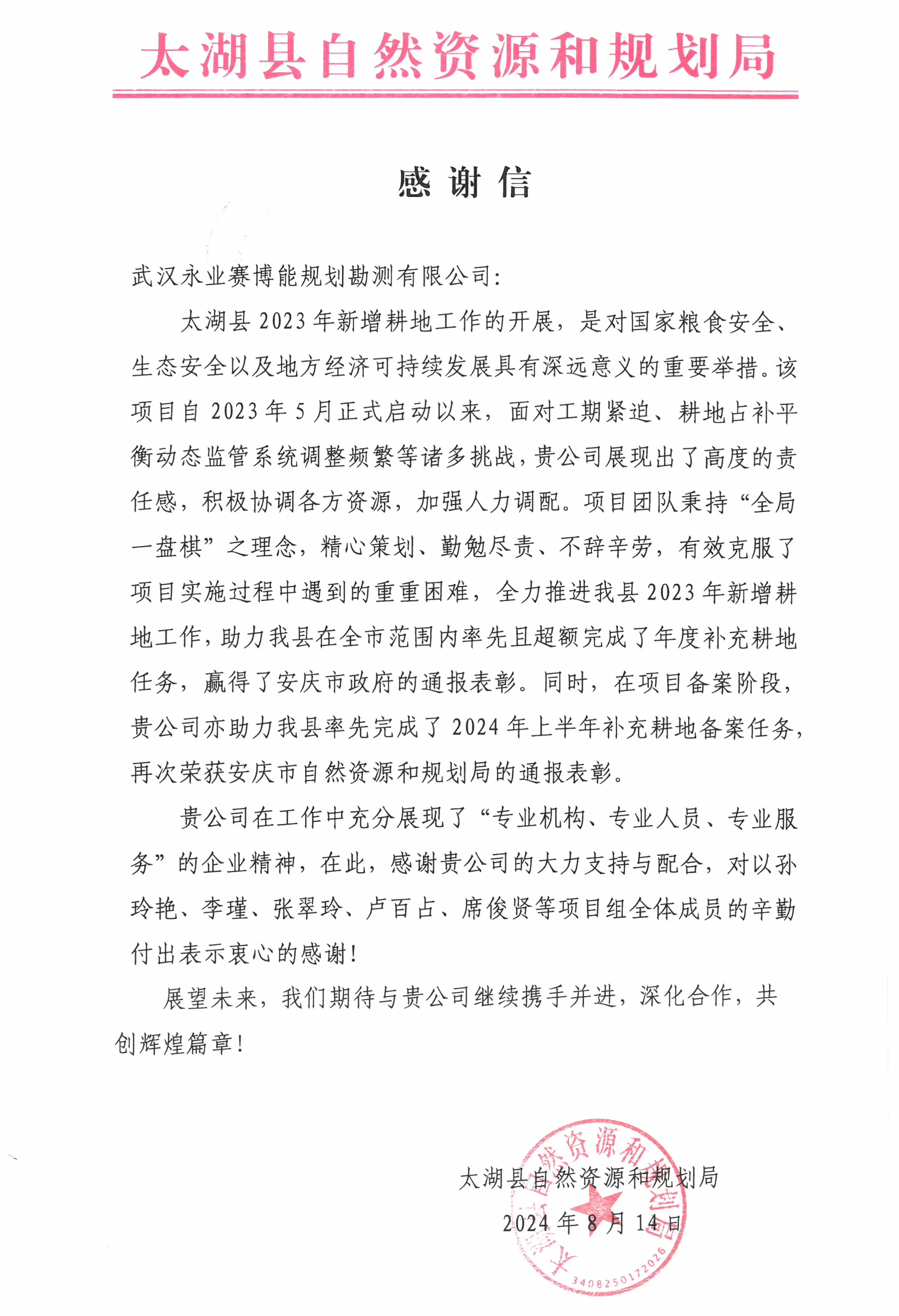信中提到永业行在面对工期紧迫、耕地占补平衡动态监管系统调整等诸多挑战,项目组成员(孙玲艳、李瑾、张翠玲、卢百占、席俊贤等)秉持“全局一盘棋”之理念,精心策划、勤勉尽责、不辞辛劳,有效克服了项目实施过程中遇到的重重困难,全力推进了太湖县2023年新增耕地工作,助力太湖县在安庆市范围内率先且超额完成了年度补充耕地任务,同时在项目备案阶段助力太湖县率先完成了2024年上半年补充耕地备案任务,赢得了安庆市政府、安庆市自然资源和规划局的通报表彰。