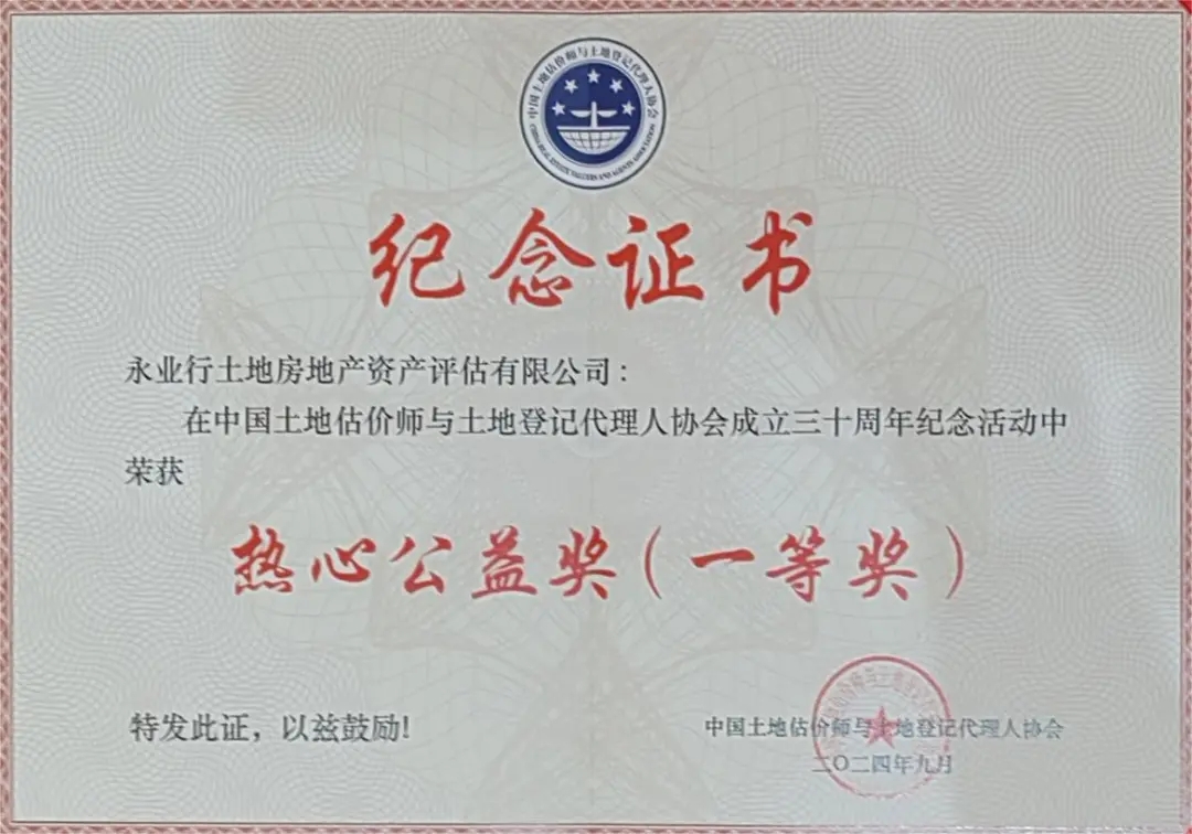 在此次评优活动中,永业行凭借其卓越的综合实力与积极的社会贡献,再次收获了行业内的高度认可,获评热心公益奖、诚信示范机构奖、业务拓展奖、土地估价报告电子化备案优秀机构奖等四项单位奖项,充分展现了公司在行业内的领先地位与良好口碑。
